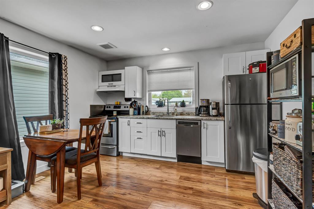 Built in 2017 this home is practically new, is on a double lot, and comes with a hidden legal duplex-style income suite. Income suite has own furnace and hot water access. You will also find a modern wood burning stove (professionally installed) and a gas chef’s range (electric range outlet also installed behind). This home was built for a home business owner with an office/bathroom that can be separated from the rest of the home. Beautiful finishes throughout starting with the gorgeous hardwood and tile floors throughout the main level. White paint, with grey and wood accents, offers you the modern feel you are after along with a highly desirable open concept floor plan. The main living room has lots of space, a large triple-pane window bringing it tons of natural light & a professionally installed wood burning stove to cozy up around. The large galley style kitchen shines with beautiful white cabinets, stainless appliances, and granite counter tops. Flow directly into the large dining area with space for a large table to entertain around and direct access out to the back deck and yard. This level also offers a bedroom with 2-piece ensuite which would make the perfect home office as it can be separated from your main living spaces with a beautiful sliding barn door. The lower-level features two more large bedrooms (one would make a great family room, playroom or home gym), and a large 5-piece bathroom with stand alone soaker tub, dual sinks, a separate walk-in shower and your washer and dryer. This level features cork floors which offer more warmth than carpet! The legal suite features the same beautiful finishes throughout. The main level provides a good-sized open concept kitchen, dining space and living room! The lower level has a good-sized bedroom and a full 3-piece bathroom with walk-in shower as well as a stackable washer/dryer. This home is situated on a large double lot and is set back leaving room for a front extension if so desired. Other features of this home include double hot water tank, dual zone furnace, and central air. Located on a quiet street in Redcliff within walking distance to the golf course, outdoor pool, river/coulee path, and shopping. This home is a must see!!!